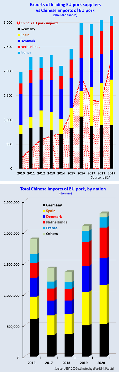 The European Union (EU) is the world pork market's highly paradoxical and most unlikely hero. Spread out over 28 countries and with half of them net pork importers, it inhabits a continent with near zero population growth. Long stagnant due to falling per capita consumption, EU pork exports more than doubled, from 1.7 million tonnes in 2010 to a USDA estimated 3.65 million tonnes in 2019 and a projected 3.9 million tonnes this year. –Led by Spain, Germany, Denmark and the Netherlands, EU exports to China tripled from slightly over 700,000 tonnes in 2010 to at least 2.2 million tonnes this year –and it did so with output barely 7.8% higher in 2019 than it was in 2010.