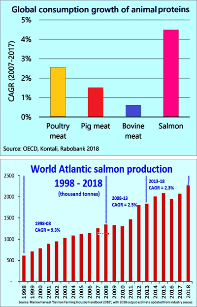 Once a niche luxury seafood, salmon has gone mainstream and overtaken chicken as the world's fastest-growing protein line. According to a recent study by Rabobank ("Keeping Salmon At the Top of the Menu: How To Maintain High Demand", RaboResearch, January 2019), the years 2007 through 2017 saw world chicken demand growth decelerate to 2.6%. Salmon consumption expanded at a 4.6% annual rate -but it would have grown even far faster where it not for an unfortunate confluence of supply-side constraints.Due to such impressive growth metrics, Rabobank's concluded that "salmon is winning the battle of the proteins." The question is, can salmon producers continue leveraging its unique advantages, overcome serious challenges and keep growing at anywhere near this rapid pace?