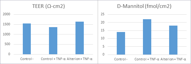 The same Caco-2 model was used to test the direct effect of Bacillus subtilis DSM 29784 on intestinal barrier function, with stimulation by TNF-α, a pro-inflammatory molecule that can lead to impairment of the intestinal barrier integrity. Transepithelial electrical resistance (TEER, voltage between the apical and basolateral side) was measured, corresponding to the passage of the molecules. The higher the TEER, the better the integrity. In addition, paracellular pathway with D-mannitol was also monitored to further evaluate the integrity of the intestinal barrier. More D-mannitol passing from apical to basolateral means that the integrity of the barrier is damaged.