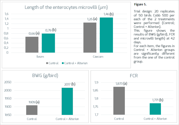 In addition, as shown in Figure 5, Alterion® can have an impact on the host intestine morphology, and improve the length of the intestinal microvilli in both ileum and caecum, thereby enhancing the surface of absorption and allowing the animal to digest more from the feed. Such enhanced intestinal nutrient absorption will result in improved animal performance (Jacquier, IHSIG 2016).