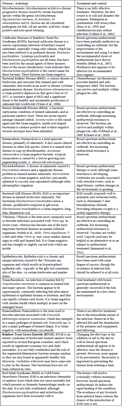 Table 2. Common bacterial fish diseases, their aetiology and treatment – control issues (Modified from (Rodger, 2010)).