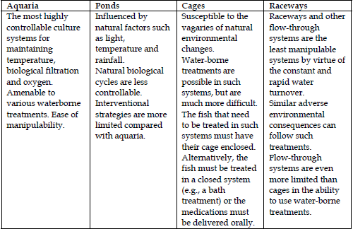 Another important factor influencing treatment is the type of culture system. The four major types of culture system are aquaria, ponds, cages and flow-through systems (Noga, 2010). The main factors that may influence a treatment's success are given in Table 6.