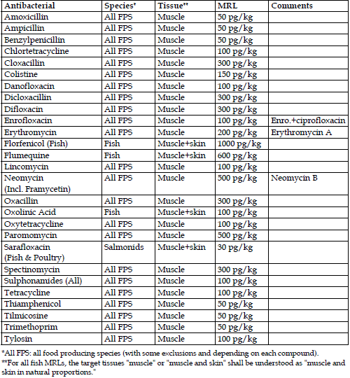 A number of international and regional codes of practice, agreements and technical guidelines exist for aquatic animals (Subasinghe, 2009). The drugs available for use and their treatment protocols are tightly regulated. The consumers of fish – and particularly in the world's richer economies – are increasingly demanding that retailers guarantee that the fish which they offer are not only of a high quality and safe to eat, but also that they derives from fisheries that are sustainable (FAO, 2011). As health threats have appeared, management practices have evolved and fish husbandry has greatly improved over the past 20 years, resulting in a reduction in the use of some chemicals, and particularly the use of antibacterials in most jurisdictions (Burridge et al., 2010). The banning of any antibacterial usage in animals based upon the "precautionary principle" in the absence of a full quantitative risk assessment is likely to be wasted at best, and even harmful at worst, both to animal and human health (Phillips et al., 2004). The antibacterials used in veterinary medicine are only prescribed by veterinarians in the European Union (EU). The prescription scheme could be discussed and improved, and non-approved and even banned antibacterials are purchased "over-the-counter" (without the need for a prescription) or their use is undeclared in fish feed formulations. The use of specifically banned antibacterials in aquaculture is a violation of regulations (Lupin, 2009). The user safety data included on labelling and packaging inserts should provide sufficient information for such occupational safety assessments to be made (Alderman & Hastings, 2009). Before approval, drugs are assessed for the definition of their maximum residue limits (MRLs) (Table 7), and their environmental impact and efficacy (Sanders, 2005). MRLs are generated by a number of bodies, such as the EU, and more globally within the framework of the FAO/WHO Codex Alimentarius Commission, which is advised scientifically by the JECFA (Joint FAO/WHO Expert Committee on Food Additives). The use of antibacterial agents in food animal species, including fish, is controlled by regulations, particularly in Europe and the USA.