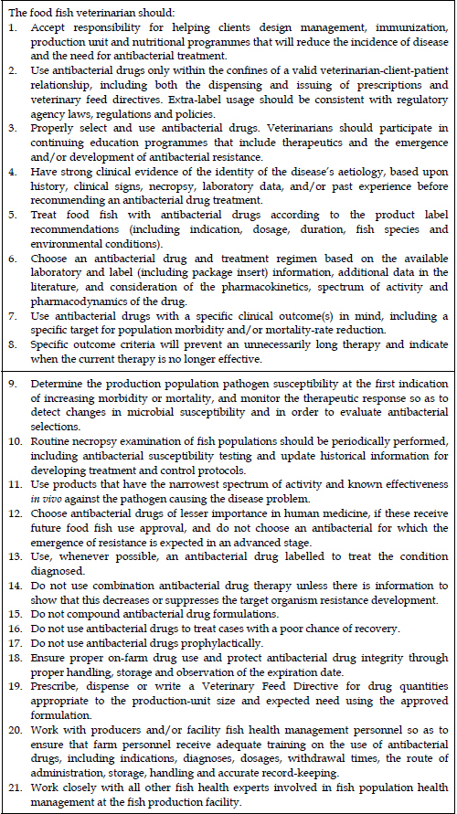 3. Recheck the fish to determine the efficacy of the treatment Judicious antibacterial use principles for veterinarians are discussed and concluded in Table 9 (FDA, 2009).