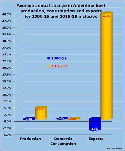 This combination of stimulative supply-side policies and strong foreign demand is profoundly turning around Argentina's beef cattle sector. From 2000 through 2015 inclusive, production stagnated, falling at an average -0.4% annual rate over these years. Based on USDA statistics, even after this year's lower beef production, the years 2016 through 2019 saw beef output increase an average of 4.2% annually.