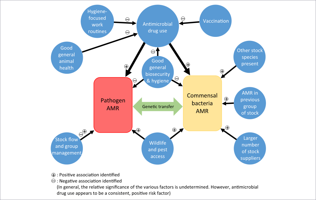 Figure 1 –Schematic diagram of some risk relationships between antimicrobial resistance (AMR) and farm factors, as identified in field studies of livestock-associated bacteria.