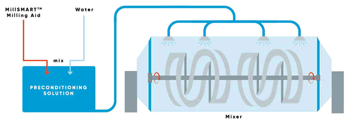 Preconditioning the mash feed ensures its moisture is at the optimum level prior to conditioning and pelleting. The preconditioning process is executed in the mixer after dry mixing. During this process, a preconditioning solution is prepared by mixing the milling aid containing surfactants with the water. This solution is then added into the mixer to precondition the mash feed (Figure 1).