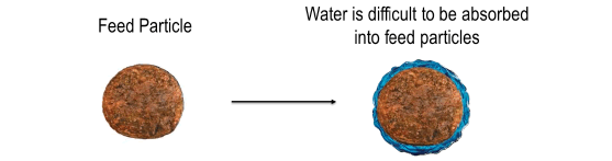 Figure 2. Cross-sectional schematic diagram showing the high surface tension of water prevents it from being absorbed effectively into the feed particles.