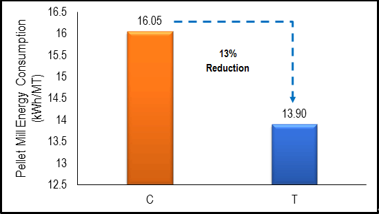 Improvement on milling efficiency was observed when the mash feed was preconditioned with preconditioning solution containing surfactants (T) (Figure 4 and 5). The pellet mill energy consumption was reduced by 13% and throughput was enhanced 16%.