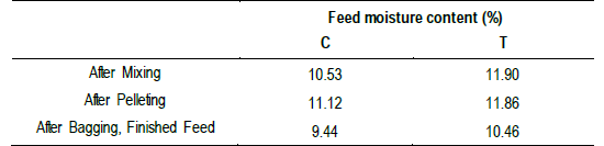 Table 1. Feed moisture content of each group after mixing, pelleting, and bagging.