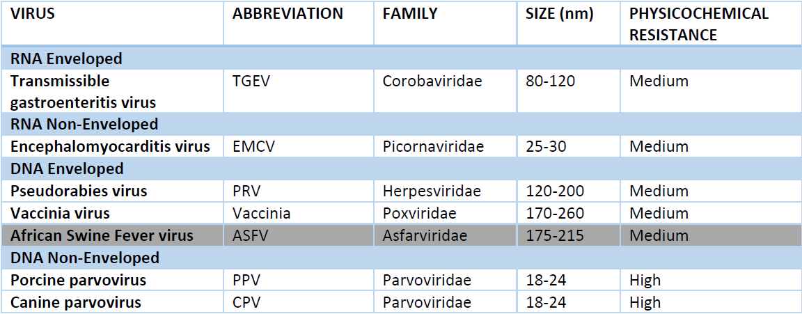 ASFv is a very particular virus. It is not commonly found in laboratories involved in processes of viral validation. However, other viruses can be studied as a model for ASFv. According to European recommendations, Poxviridae, like Vaccinia virus (dsDNA, enveloped), shares common characteristics with ASFv and thus it is an excellent virus model for a viral validation. In Texcell's technical report, both steps were studied in worst case scenario and attenuated conditions, in order to determine the kinetics of inactivation and explore its robustness.