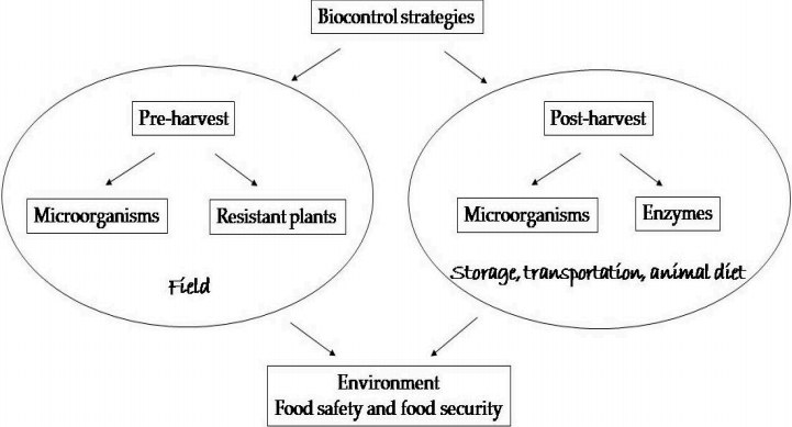 According to Cleveland et al. [29] treatment of soil with nontoxic Fusarium verticillioides was useful in eliminating strains that produce fumonisin and inhibited them to synthesize this toxin. Luongo et al. [30] also showed lower presence and activity of toxigenic F. рroliferatum and F. verticillioides in corn residues by implementation of non-pathogenic Fusarium fungi. Sarrocco and Vannacci [27] described useful preharvest Figure 1. A schematic presentation of the biological strategies.