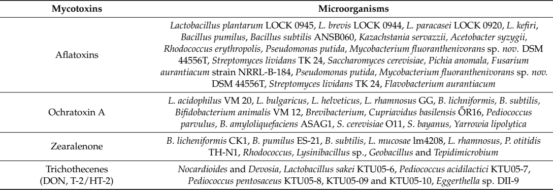 Table 2. The use of microorganisms (bacteria, yeast and fungi) for the control of common mycotoxins (Adapted from Taheur et al. [43]).