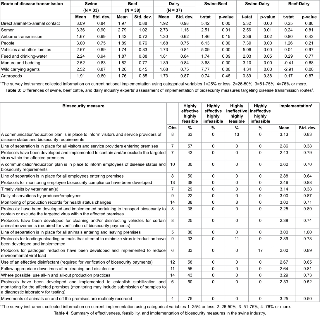 Rating of effectiveness, feasibility, and implementation of biosecurity measures targeting specific disease transmission routes are summarized in Table 2 for the swine, beef cattle, and dairy industries, respectively.