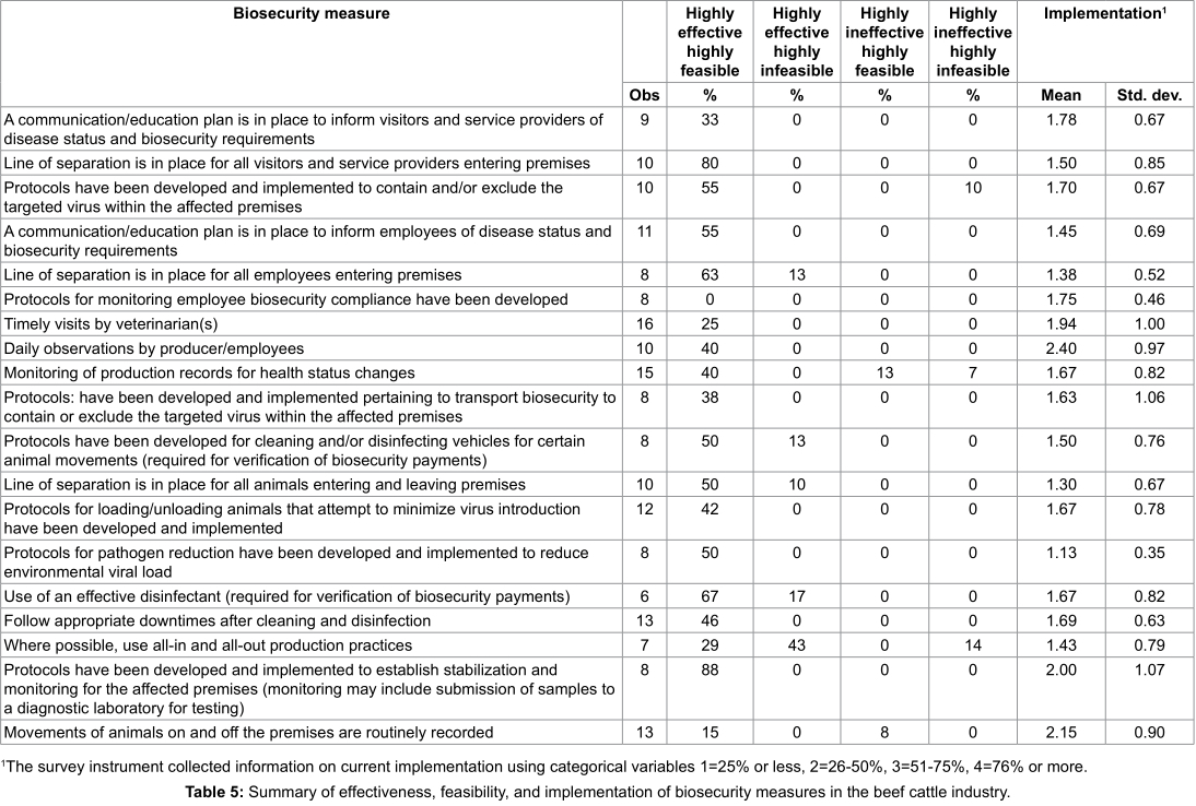 Data from the survey software were exported and analyzed in Excel (Microsoft, Redmond, WA) and STATA [20]. As commonly used for the analysis of this type of data [21-23], cross-tabulations were used to compare responses by effectiveness, feasibility, and implementation. For example, of interest is whether biosecurity measures targeting a specific disease transmission route are both highly effective and highly feasible or highly ineffective and highly infeasible or some combination of the extreme ratings. Similar assessments were performed for specific biosecurity measures.
