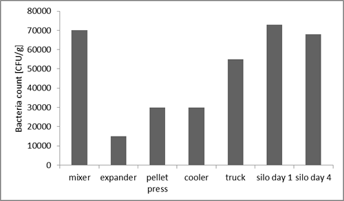 Even in a hygienic environment, feed can be infected to a certain degree with fungi, bacteria or yeast. Peisker (2011) demonstrated that there is a typical recontamination pattern during the journey from the feed plant after pelleting to the farm silo (Figure 1), especially when no chemical stabilizer, such as an organic acid, is added.