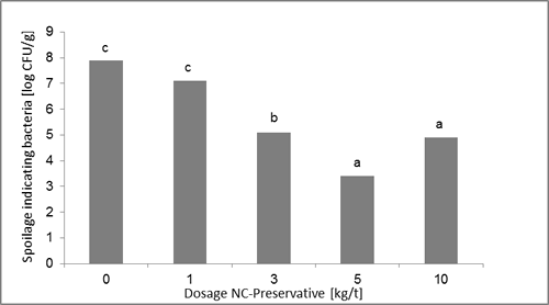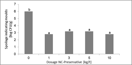 The use of 1 kg/t NC-preservative resulted in a significant >3 log reduction (or a reduction by 99.95%) of moulds in the stored feed for fatteners (Figure 3).