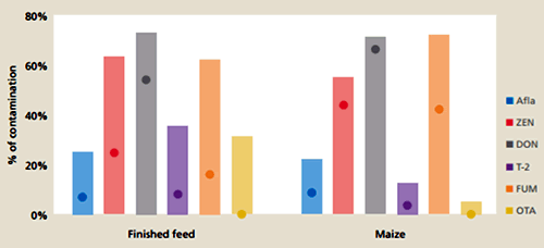 Bars indicate percentage of samples testing positive for mycotoxin presence. Dots indicate percentage of samples registering concentrations known to impair animal health or performance. Source: BIOMIN, 2015