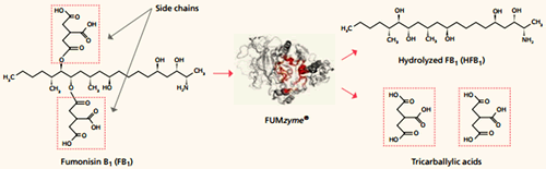 Figure 2. FUMzyme® detoxifies fumonisin molecules by cleaving the two tricarballylic acid side chains