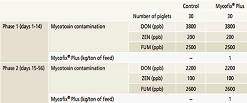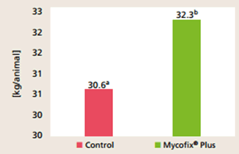 The fifth generation of Mycofix® is a fully revamped formulation of the Mycofix® product line. It has been optimized in order to boost effectiveness in the field. A trial under field conditions was performed with 60 weaned piglets receiving a diet naturally contaminated with mycotoxins over 56 days (Table 1). At the end of the trial, piglets supplied with Mycofix® Plus had a final weight of 32.3 kg versus 30.6 kg for the control group (Figure 5). An economic calculation based on the weight difference between the two groups clearly showed the overall benefit of the optimized Mycofix® with an ROI of 7.42 based on feed and piglet live weight prices based on average European price for June 2015.