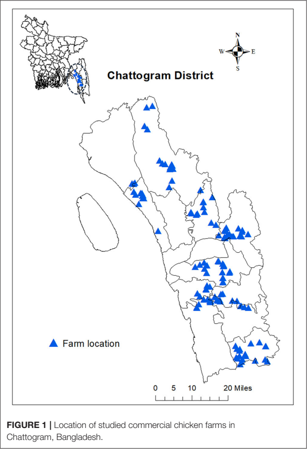 STATA 16 was used for the analysis (1985–2019, StataCorp). Farm locations were plotted across Chattogram district using ArcMAp 10.8 (ArcGIS, 1995–2019 Esri Inc.).
