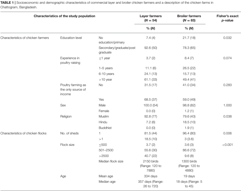Thus, this study aimed to assess (1) the frequency, purpose of usage, and sources of antimicrobials on commercial broiler and layer chicken farms in Chattogram, Bangladesh; (2) whether antimicrobial usage was associated with farmers' and farms' characteristics; (3) and the clinical signs for which antimicrobials were administered. In addition, compliance with the antimicrobials' withholding periods was evaluated.