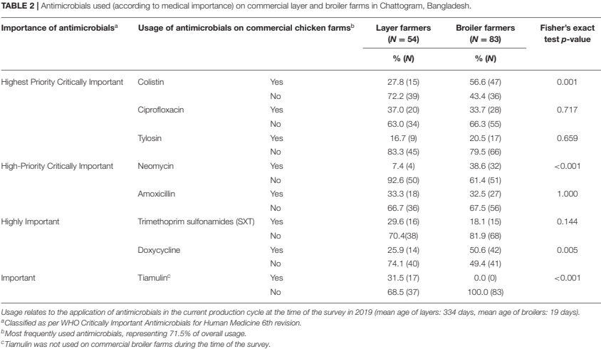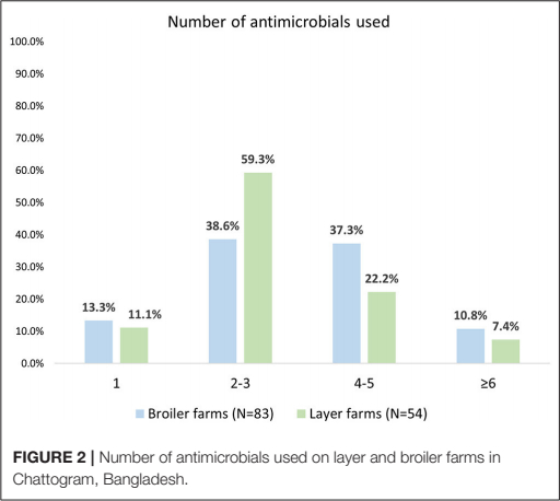 There is little reliable data on the extent of antimicrobials usage in the livestock production system across South East Asia (42–44) and in particular, from commercial poultry farms in Bangladesh (15, 32). We were able to provide detailed data of antimicrobial usage in the commercial layer and broiler industry of Bangladesh. In addition, while previous studies used convenience sampling to describe antimicrobial usage on