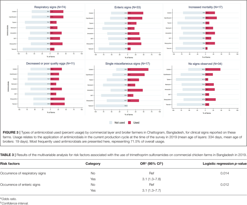 Layer farmers reported selling eggs and broiler farmers selling chickens while administering antimicrobials. Antimicrobial residues was previously found in poultry in Bangladesh (55–57). For instance, trimethoprim sulfonamides, which were frequently used by layer farmers while selling eggs, are not approved to be used in laying chickens as the trimethoprim residues can be detected in egg yolk as well as albumen for more than 7 days after its administration (58). Farmers in Bangladesh may not be aware of withholding periods and the residual effects of antimicrobials (32). There may also be a lack of information from veterinarians on withdrawal periods of antimicrobials (32). Furthermore, continuous occurrence of clinical signs might result in farmers deciding to constantly use antimicrobials on their chickens until the time of sale of their poultry products (59).