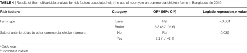 Neomycin was more frequently used on broiler farms and by farmers who sell antimicrobials. The relatively low cost of neomycin may be the reason for its frequent usage (53) but also its re-sale by commercial farmers.
