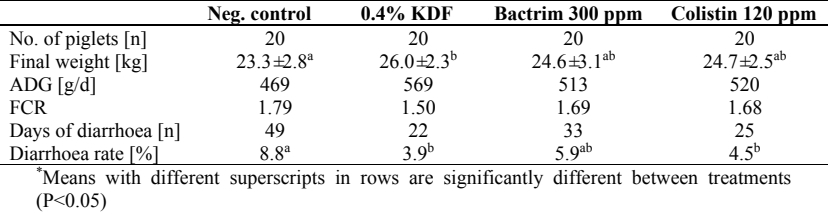 Table 1. Performance parameters and diarrhoea rate of piglets fed KDF and different AGP (modified after Lückstädt et al., 2012)*