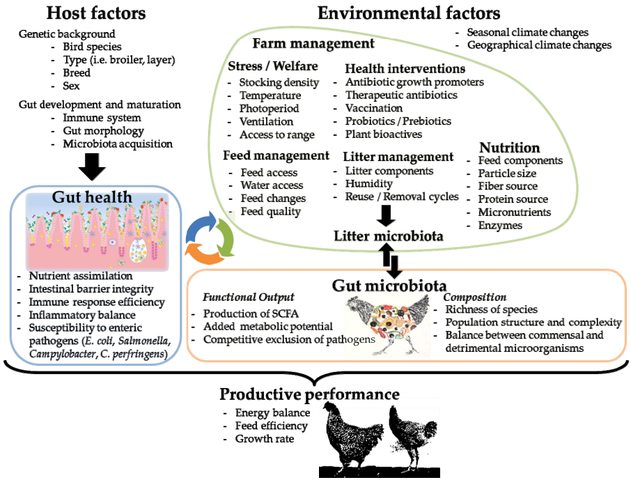 The structure and functionality of the intestinal microbiota is crucial for the health of poultry since the process of acquisition and maturation of the gut microbiota throughout the growth cycle of the birds has a strong influence on the development of the intestinal epithelium and the modulation of the physiological functions required to maintain intestinal homeostasis (i.e., immunity, nutrient digestion, intestinal barrier integrity), and in turn these functions are essential to optimize the efficiency of extraction and use of energy by the host [ 2 ]. In this review, most of the information available about the factors that shape the gut microbiota of poultry regarding their interaction with the physiological functions of the host has been collected, with focus on the impact of these interactions on intestinal health and productive performance of the birds.