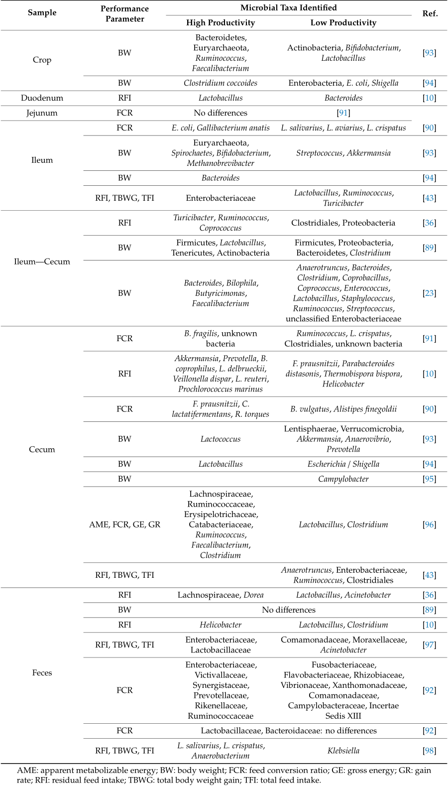 Each section of the chicken gastrointestinal tract has a different profile of microorganism, though they are closely related. The results of microbiota studies are influenced by intrinsic characteristics of birds such as genetic, gender, age, breed, health status, as well as by farm conditions including type of diet, feed additives, environment, and farm management, among others. Table 1 summarizes the microbial taxa associated with high and low productivity in different gut sections of the chicken's intestine.
