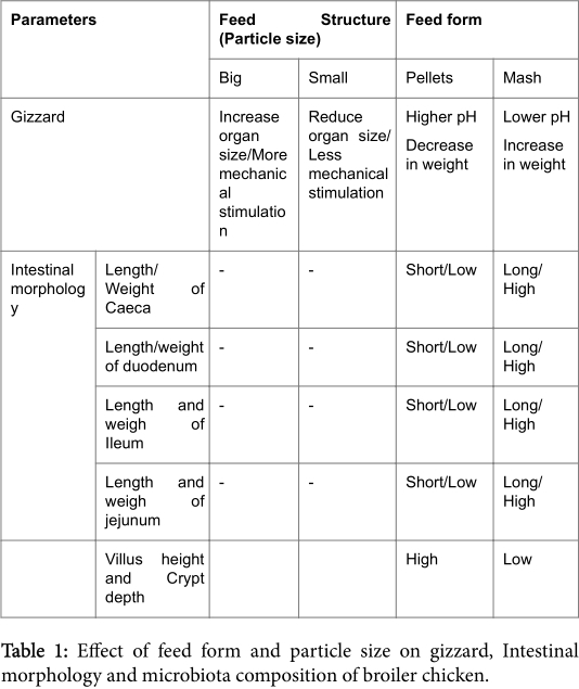 food [63-67]. Feed form and its characteristics also influence the microbiota composition and function in the GIT. The presence of these microbiota play very crucial role by stimulating the development of the digestive tract to enable it perform functions of nutrient digestion, gut mucosal proliferations, growth of digestive enzymes, synthesis and utilization of vitamins and fermentation processes [68,69]. Short-chain fatty acids (SCFA) are produced through fermentation and this stimulates the development of the digestive system through the increase in size and tissue components of the guts (Table 1). Fermentation in the hindgut by microbes yields mainly lactic acid like acetate, propionate and butyrate which are produced in the cecal digesta [69]. These appear to accelerate gut epithelial cell proliferation, thereby increasing intestinal tissue weight [70-74]. Mucosa development is retarded in chicks if feeding is delayed therefore the form and particle size must be considered in relation to the age of the broiler [16,75-77]. The compositions of the diet and the microbiota and their interactions also affect the intestinal development, mucosal architecture and the mucus composition of the lower digestive tract [69]. The microbiota also help in the building of a strong immune system and since there is a strong relationship between diet form and microbiota development, the health of the broilers are also improved [65,69].