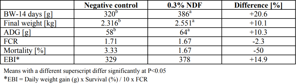 Table 2: Performance parameters of broilers fed with or without 0.3% Formi NDF for 39 days