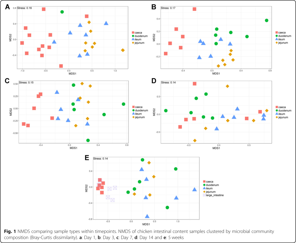 In this study we compared the bacterial microbiota of duodenal, jejunal, ileal and caecal samples of Ross 308 broilers at 5 timepoints: 1 day, 3 days, 7 days, 14 days and 5 weeks of age. Similar to the studies above, we found significant differences in the microbiota compositions of specific sample types with age and significant differences between sample types within timepoints.