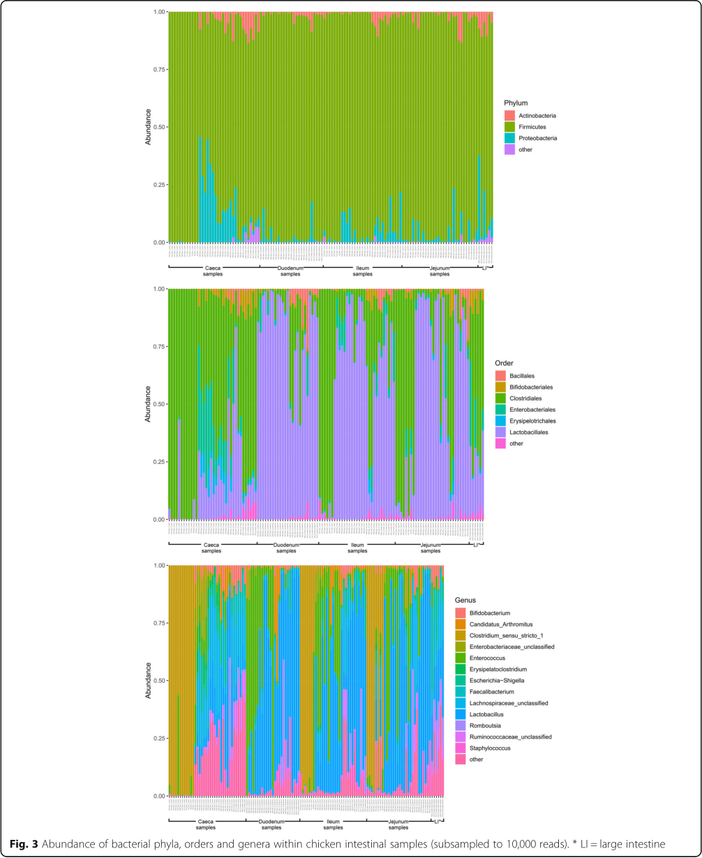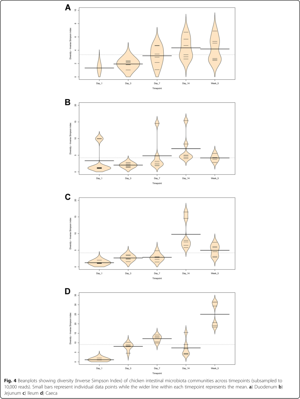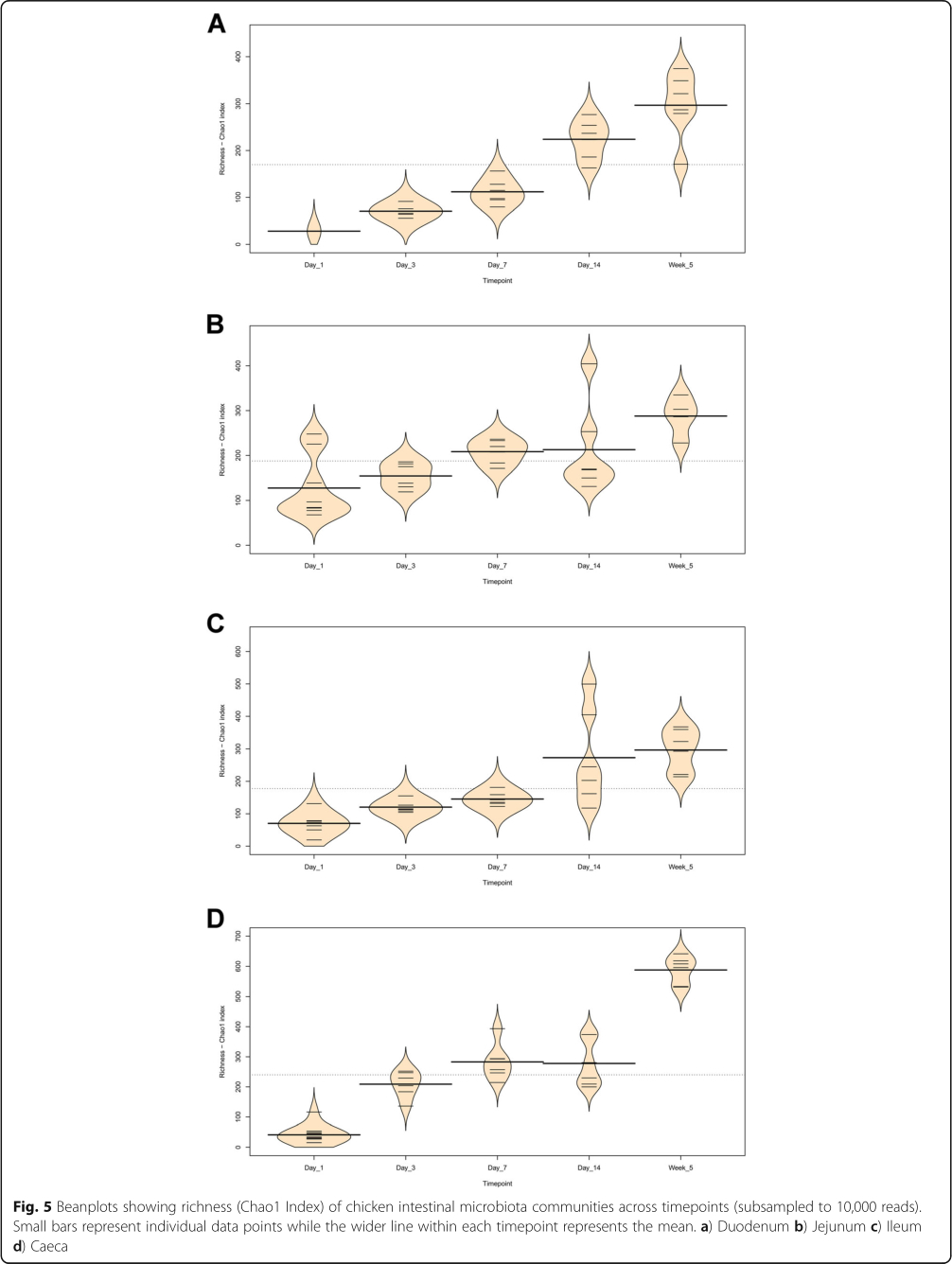 Several studies have directly compared samples taken from the small intestine with those from the caeca at specific timepoints [17, 18], and at various life stages. Lu et al. compared ileal and caecal samples from commercial Ross-hybrids, taking samples at day 1, 3, 7 14, 21, 28, and 49days of age [14]. A separate study examined ileal and caecal samples from Hy-Line W-36 commercial layers at 9 timepoints, starting at 1week of age [20]. Ileal and caecal samples were also characterised at various timepoints starting at 1 week of age by Johnson et al. in Cobb 500 birds [23].