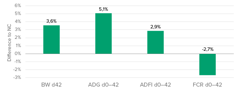 Figure 1: Difference in body weight d42 and ADG, ADFI and FCR during the whole trial period from d0 to d42 between PFA and NC in %.