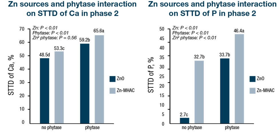 Along with performing similarly as zinc oxide at lower inclusion where growth was concerned piglets receiving Zn-MHAC also exhibited better phosphorus digestibility (12.68% increase) even in the presence of 500 FTU/kg phytase. The evidence of higher phosphorus digestibility could explain the compensatory growth performance of piglets supplemented with Zn-MHAC compared with zinc oxide. Researchers also found that 100 ppm of zinc from Zn-MHAC provided a greater uplift in calcium digestibility (6.45% increase) than zinc oxide even with the presence of 500 FTU/kg phytase. This result suggests that Zn-MHAC optimizes the effect of the phytase, allowing the body to absorb more calcium.