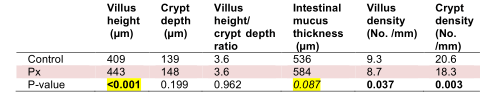 We (Tonisity) wanted to scientifically test the idea that Px would help the growth of the intestinal epithelium. The usual approach to assessment of intestinal structure begins with microscopic measurements of the intestinal villi, which are the finger-like projections that line the small intestine and serve as the anchor for all intestinal cells. Villus height is used as a marker of intestinal health, and villus height decreases in the presence of inflammation or bacteria. The thickness of the mucus layer is also measured as an indicator of intestinal health and its ability to resist infection. The mucus layer helps to prevent bacterial adhesion and also contains antimicrobial molecules that are secreted by the intestinal cells.