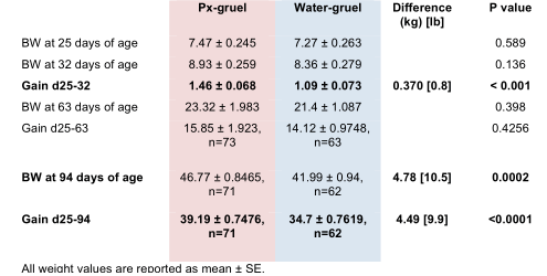 Pigs were weighed individually when they were 2, 25, 32, 63 and 94 days old. On day 32 of age, weaning weight differences were 370 grams [0.8 lb]. By day 94 (13 weeks of age, 9 weeks post-weaning), Px pigs were 4.78 kg [10.5 lb] heavier. Px pigs had gained an average of an extra 4.49 kg [9.9 lb] in the 9 week nursery period with no extra feed or special treatment.