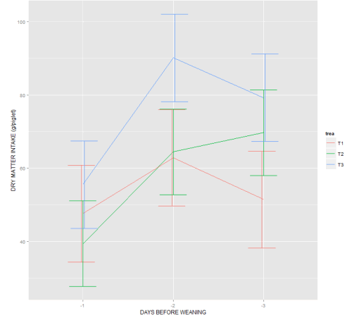 equalised differences between the volume and weight of the gruel and dry feed. The number of pigs that required antibiotic treatment in the post-weaning period was also tracked.