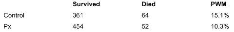 Also, the PWM in this study was significantly lower in the Px group (4%) compared to the control group (19%), with P = 0.015, representing a 75% reduction in PWM.