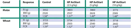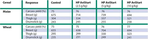 Regardless of whether broilers received the wheat or maize-based diet, feed conversion rate and carcass yield were both improved if the diet contained HP AviStart. The highest dose of the specialty soy protein gave the lowest FCR compared to the control (table 1).