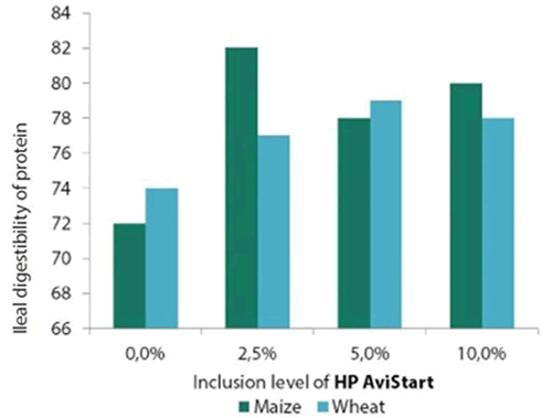 Figure 1. shows that, in the maize-based diet, the greatest improvement in the ileal digestibility of protein was 10% at an addition level of 2.5% HP AviStart. The maximum improvement in the wheat-based diet was 5%, observed in broilers fed the diet with 5% HP AviStart.