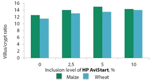 In broilers fed both the maize and wheat-based diets, villus/crypt ratio increased following a starter diet with HP AviStart and was highest at a 5% addition rate. A strong correlation was observed between villus/crypt ratio and breast meat.