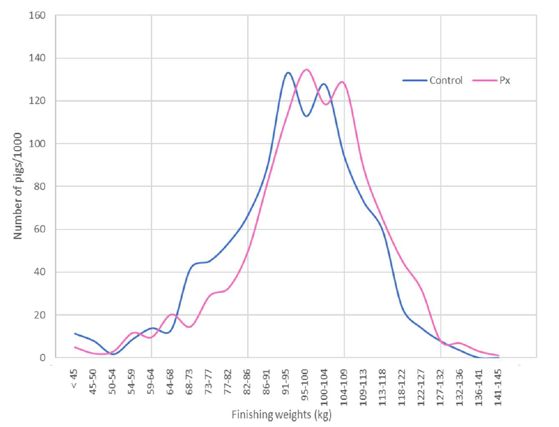 Perhaps the most pertinent outcome was that the TPX group produced a more compact slaughter weight profile. More pigs in this group made the grade with far fewer underweights recorded - a benefit that has significant economic relevance for a commercial pig production business.