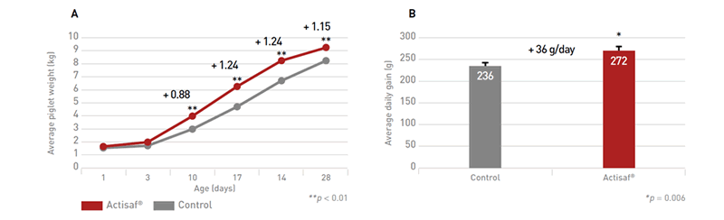 Many studies have demonstrated the importance of feeding piglets a creep feed from around 12 days of age (Carstensen et al., 2005; Pluske et al., 2007) and supplementing piglets with Actisaf® in this feed can further boost the benefits of creep feeding by stimulating the immune response and modifying the gut microbiota. A study has shown that feeding Actisaf® to suckling piglets from birth until weaning improved piglet performance (Figure 6).