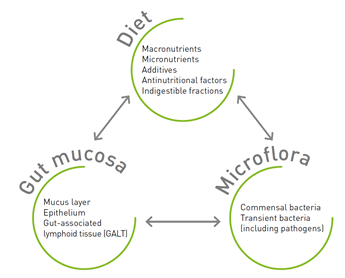 Several factors are involved in piglet gut health maintenance. Diet, gut mucosa and the microbiota have been proposed by Conway (1994) as the three major players in piglet gut health (Figure 1).