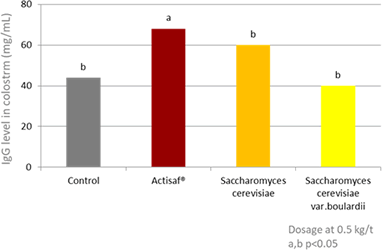 This improves the piglet's immune response to the pathogens which the sow has already been exposed to, thereby improving piglet gut health and performance during the suckling period. Another study has taken this a step further and demonstrated that supplementing sow diets with Actisaf® during gestation and lactation not only increases IgG in the colostrum (Figure 3), but also maintains higher levels of IgG and IgA in the milk during the lactation period (Zanello et al., 2013). This study highlighted the specificity of Actisaf® Saccharomyces cerevisiae Sc 47 proprietary strain on the enhancement of the immune quality of sow colostrum.