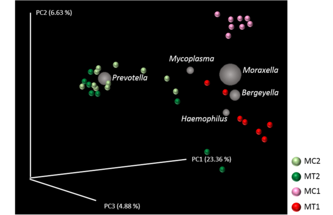 Analysis of the beta diversity both before and after elimination of antimicrobials, showed remarkable differences in the bacterial population of the nasal microbiota (Fig. 2). Antimicrobial treatment explained 22.63% of the differences observed (P = 0.001). The five most abundant genera explaining the divergence between the nasal microbiota before and after elimination of perinatal antimicrobials were: Prevotella, Moraxella, Bergeyella, Haemophilus and Mycoplasma (Fig. 2). When the beta diversity was analysed in each farm individually, significant differences were observed after elimination of the antimicrobial treatment in both farms (adonis, R 2 = 0.2186, P = 0.001 for MC and R 2 = 0.1935, P = 0.005 for MT). Elimination of antimicrobials caused significant changes in the relative abundance of several genera. Among others, Lactobacillus, Phascolarctobacterium, Megasphaera, Roseburia and Campylobacter were increased in both farms. The mean of the relative abundance of the Prevotella genus increased also after elimination of the antimicrobials, but this increase was only statistically significant for MC farm (Table 1). On the contrary, the relative abundance of Moraxella and Bergeyella significantly decreased, while Haemophilus and Mycoplasma showed a decreased tendency when antimicrobials were removed in farm MT, but increased in farm MC (Table 1). Finally, the relative abundance of Neisseria decreased after removal of antimicrobials, showing to be significant in MC farm (Table 1).